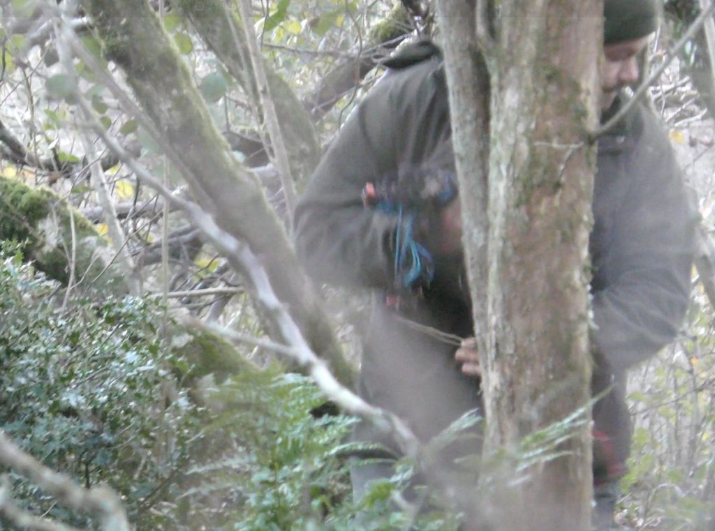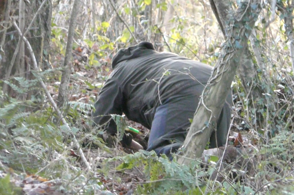 While the sab on the road rang the police, the sab at the sett documented the scene and found somewhere to wait for the terriermen to return. Before they did, a second fox appeared from the area of the sett, crossed the valley and ran to safety. It’s possible the hunt had been trying to dig out this second fox when we arrived.