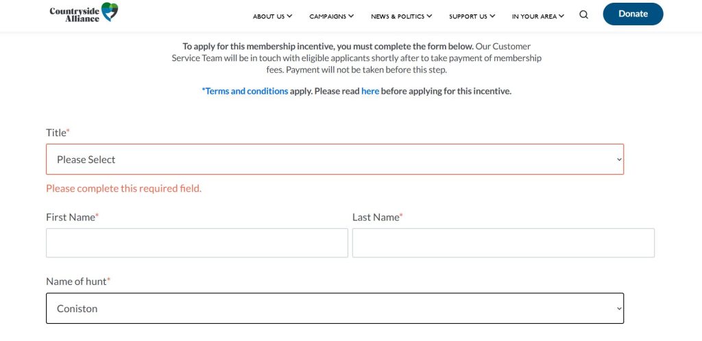 Up until 8:00am yesterday morning, the Countryside Alliance would have donated £50.00 to anyone joining the Coniston Foxhounds via the hunt membership scheme on their website. Such a donation would have paid for a couple of the heavy-duty shovels they take out onto the fells to dig out foxes or, perhaps, it could have been put towards another terrier location device so they could continue to send terriers underground to attack foxes.